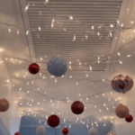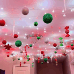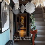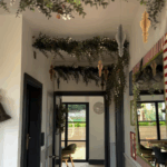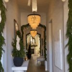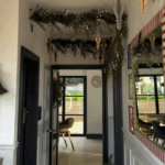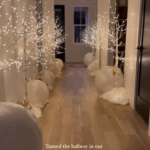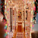 This hallway takes the previous example a step further by adding a silver garland to the ceiling. It’s such an inviting and nostalgic look!