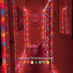Outlining your door and floorboards with Christmas lights creates a festive yet functional look that allows you to see where you are going in the hallway without turning on the lights. Clever!