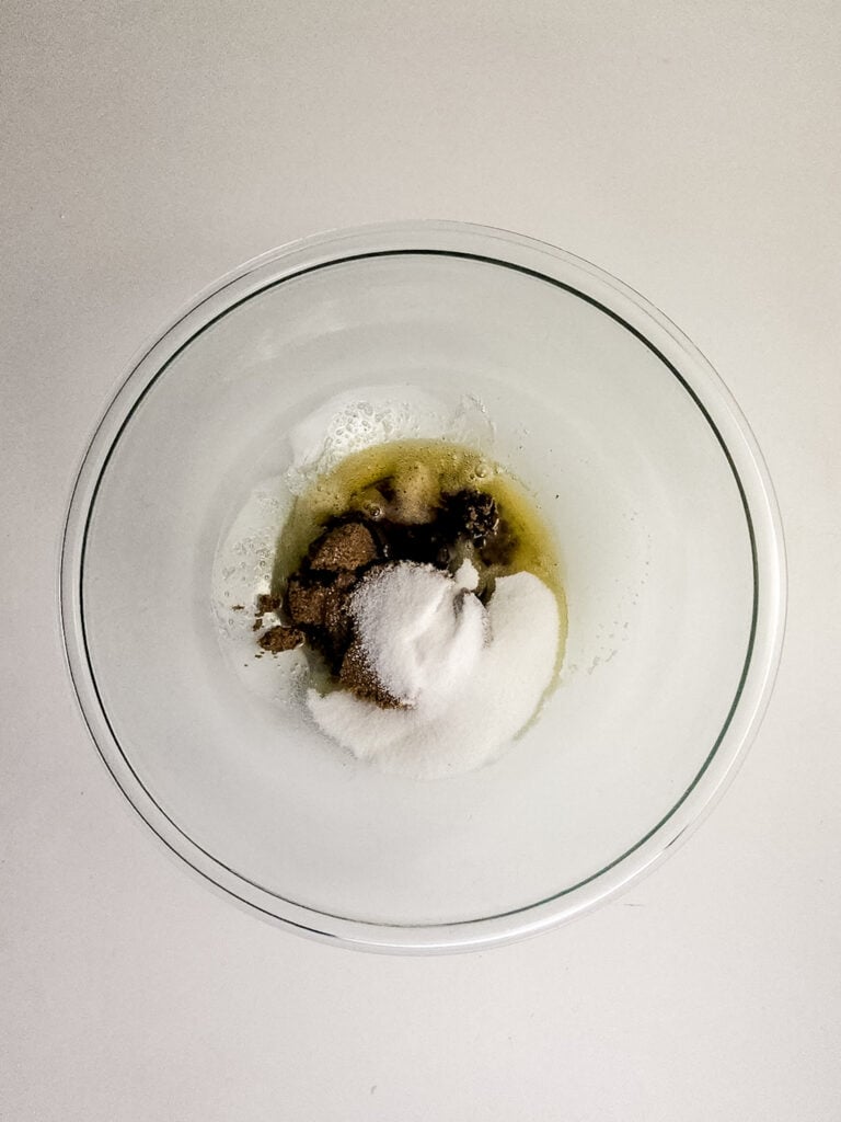 - In a large mixing bowl, cream together the softened butter and dark brown sugar until light and fluffy.
