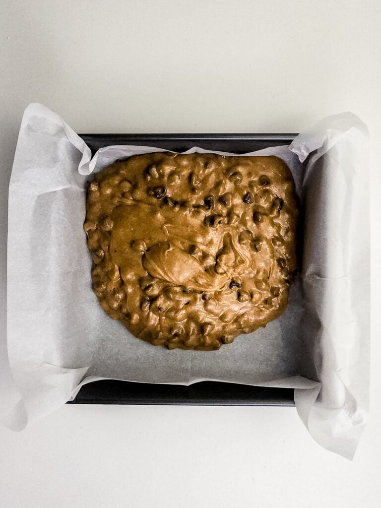 - Preheat your oven to 350°F (175°C). Line an 8×8 square baking pan with parchment paper, leaving a little overhang on the sides for easy removal.