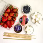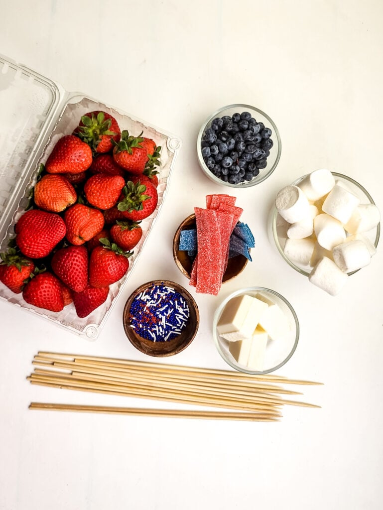 - Lay out all your ingredients in an assembly line: marshmallows, strawberries, blueberries, sour candy, and cheesecake bites.