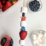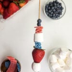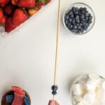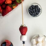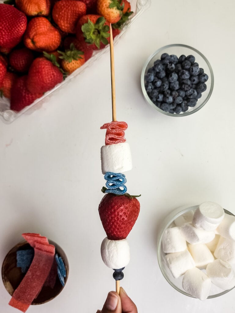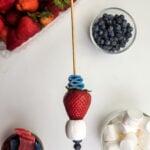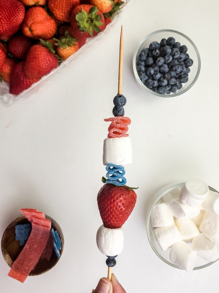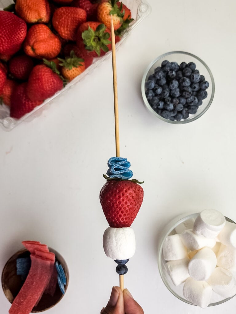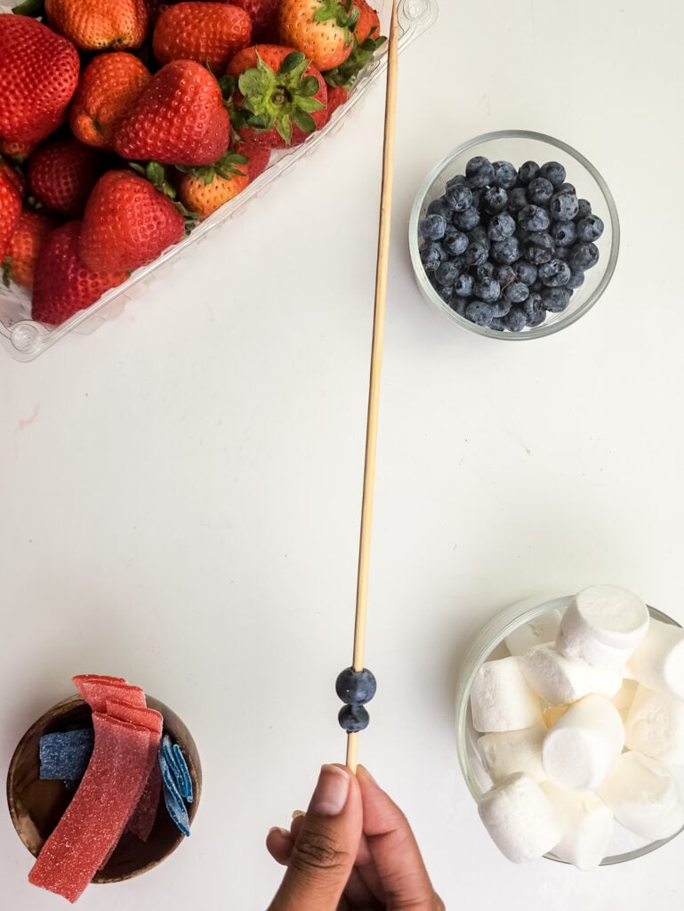 G. 1 marshmallow or strawberry to finish - Repeat the pattern for all skewers, aiming for a colorful and balanced look. Be sure to use 2 blueberries together each time for a bold pop of blue.