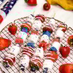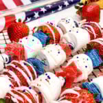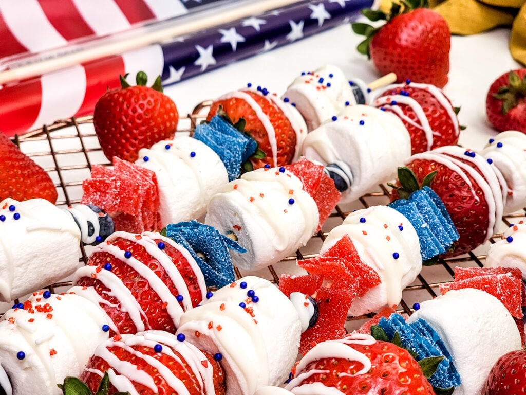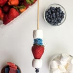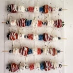 If you’re searching for a fun and festive way to serve dessert this Fourth of July, these patriotic dessert skewers are sure to be a hit! Stacked with fluffy marshmallows, juicy strawberries, sweet blueberries, creamy cheesecake bites, and a strip of red or blue sour candy, these skewers are as eye-catching as they are delicious. They’re easy to assemble, perfect for both kids and adults, and make a colorful addition to any Independence Day celebration. Get ready to wow your guests with this simple, no-bake treat that’s bursting with red, white, and blue!
